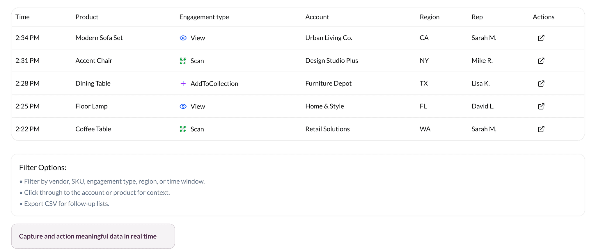 Every interaction in one stream: product views, QR scans, and "add to collection" events across all end-users.