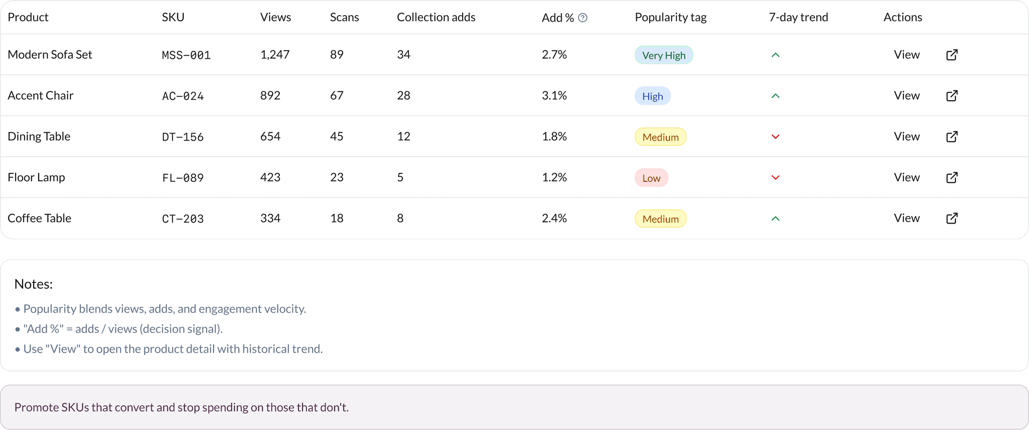 Ranked SKUs with trends so you can push winners and fix—or drop—laggards.